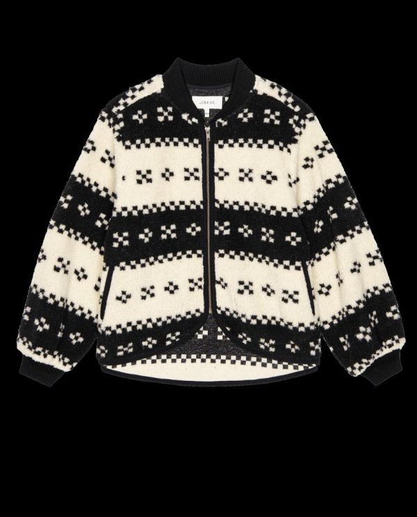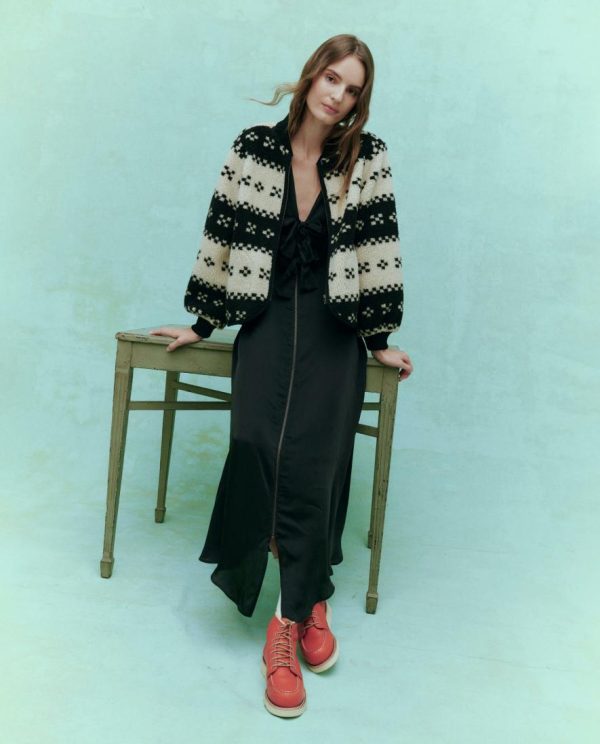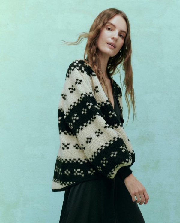 The Plush Bomber. is a cozy and relaxed zip-up jacket crafted from the softest plush fabric knit in a graphic geometric jacquard pattern. Distinguishing characteristics include a charming shirttail hemline, contrast stretch binding around the edges, a bomber style rib neckline, billowy sleeves with a rib cuff, and cozy welt pockets.