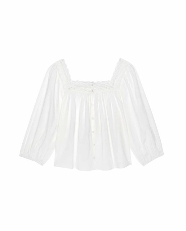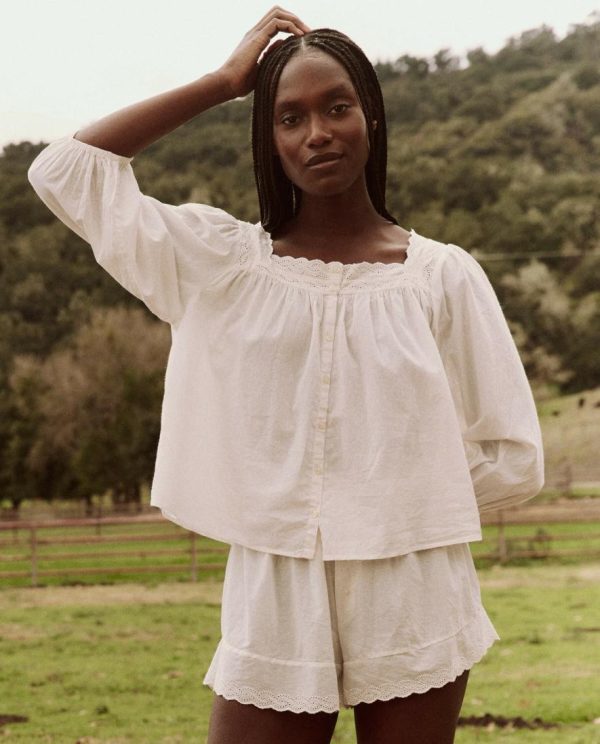 The Eyelet Button Sleep Top. is a romantic addition to your sleepwear collection. Crafted from supersoft and lightweight cotton voile fabric, the top is adorned with a Victorian-inspired eyelet lace trim and finished with a delicate scalloped edge. This top was designed to fit easy through the body for added comfort and features elasticated sleeve openings with delicate volume and dainty buttons up the front. Pair it back to the matching The Eyelet Easy Sleep Pant. or vintage denim for a casual daytime look.